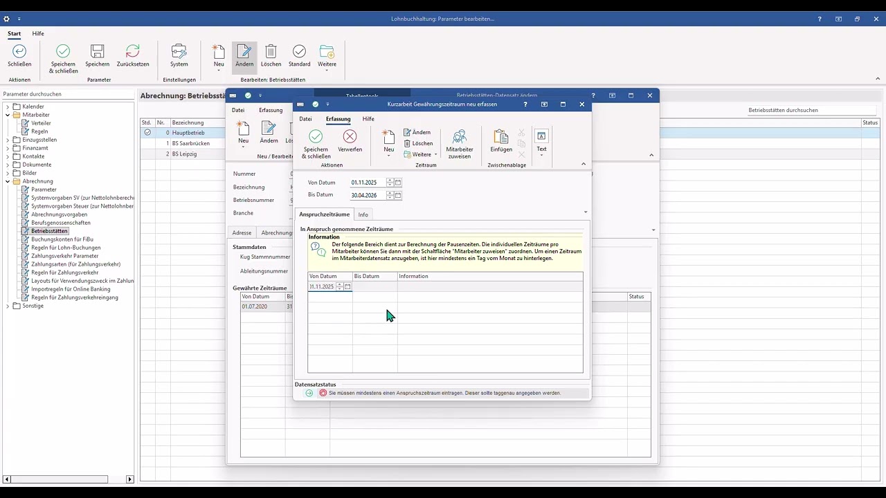 Weitergehende Informationen, wie etwa zur Mitarbeiterzuweisung, finden Sie im Abschnitt: Einstellungen in den Parametern (Kurzarbeitergeld).