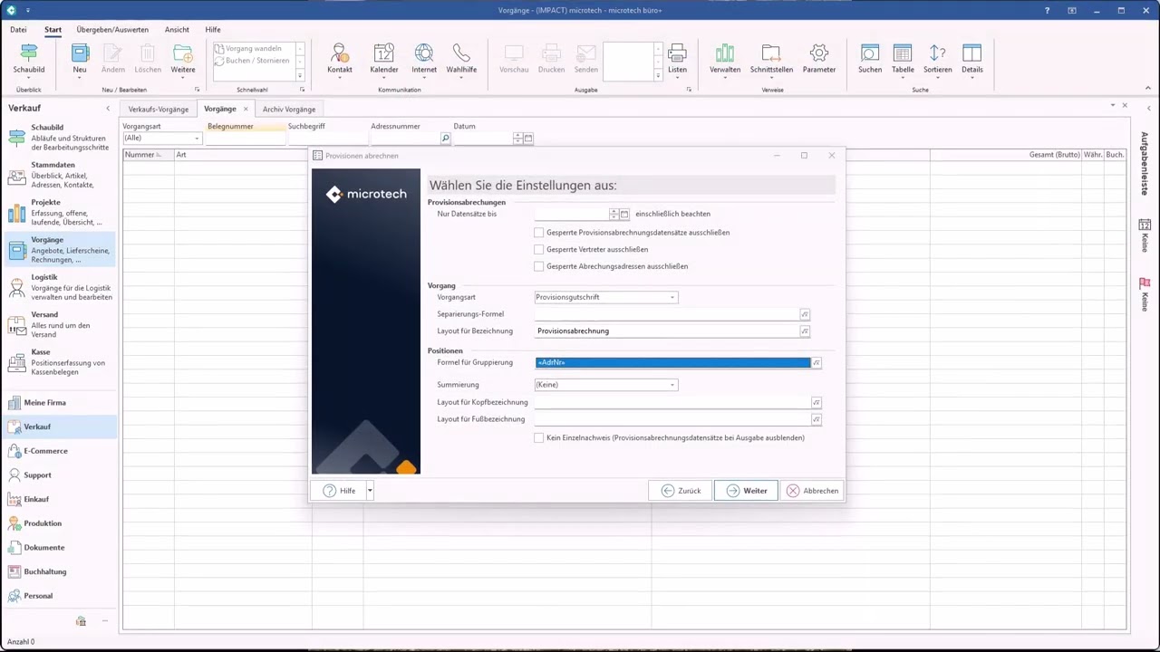 Den Assistenten finden Sie im Bereich VERKAUF – VORGÄNGE über die Schaltfläche: WEITERE und den Eintrag „Provisionen abrechnen".