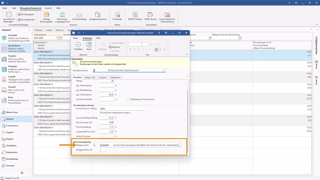 Die Abrechnungsbelegnummer wird automatisch in den Provisionsdatensatz eingetragen
